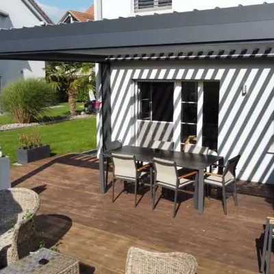 Durch die Anpassungsfähigkeit der Lamellen können Sie die Sonneneinstrahlung und somit die Temperatur auf Ihrer Terrasse natürlich regulieren. Dies reduziert die Abhängigkeit von künstlichen Klimatisierungssystemen wie Storen und Klimaanlagen, was sowohl umweltfreundlich als auch kostensparend ist.